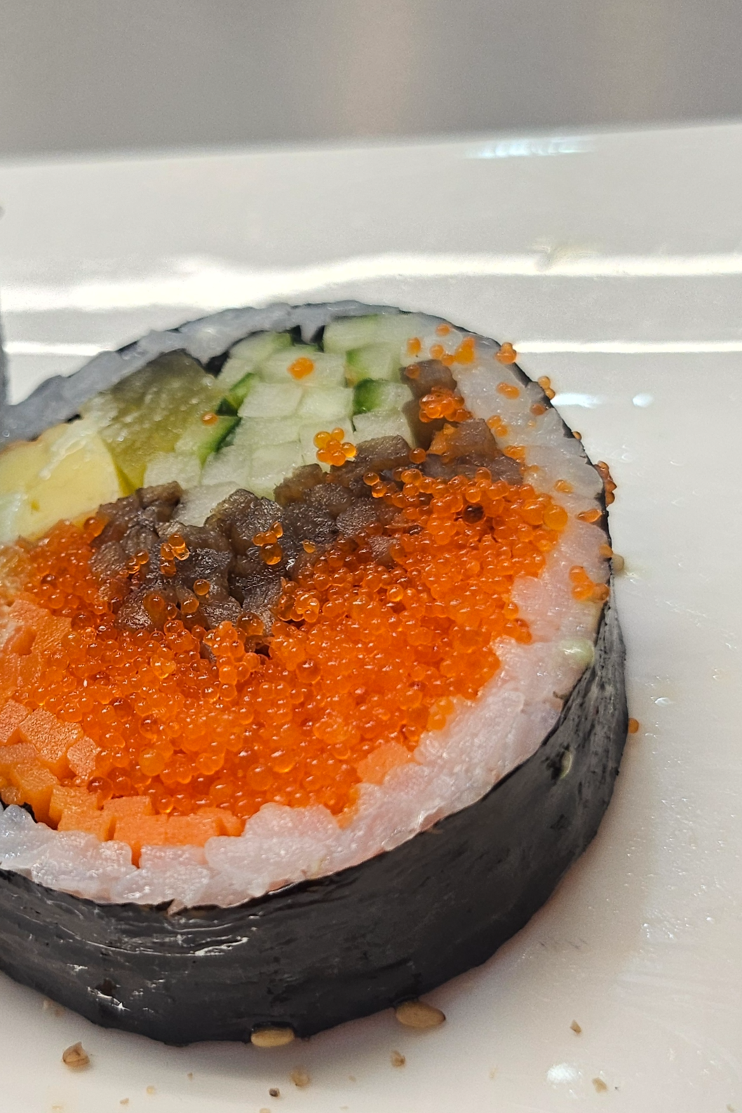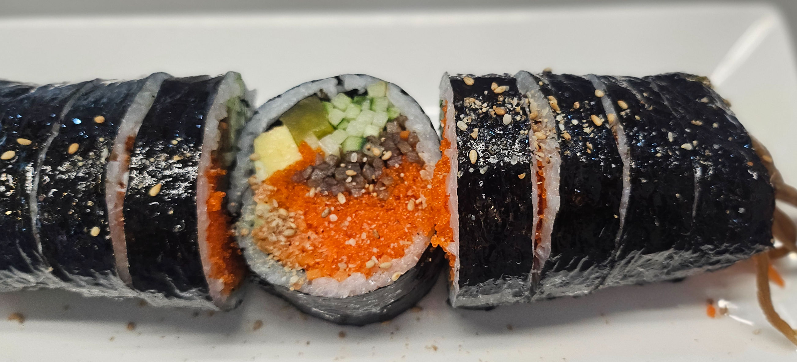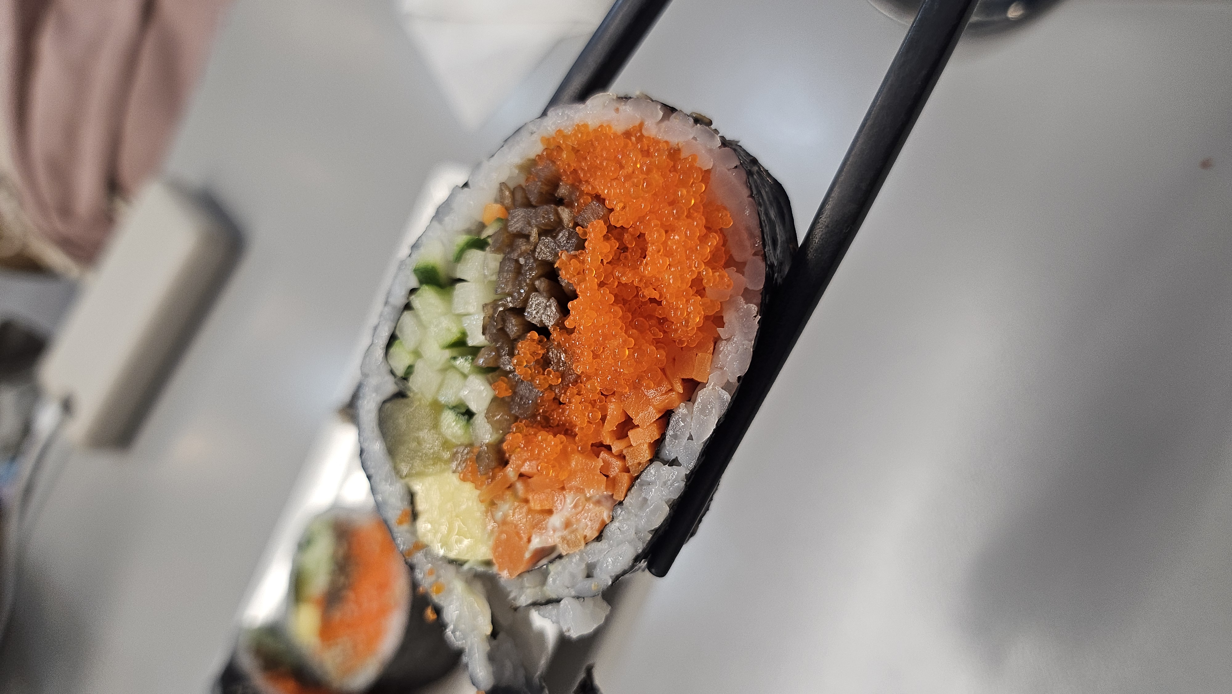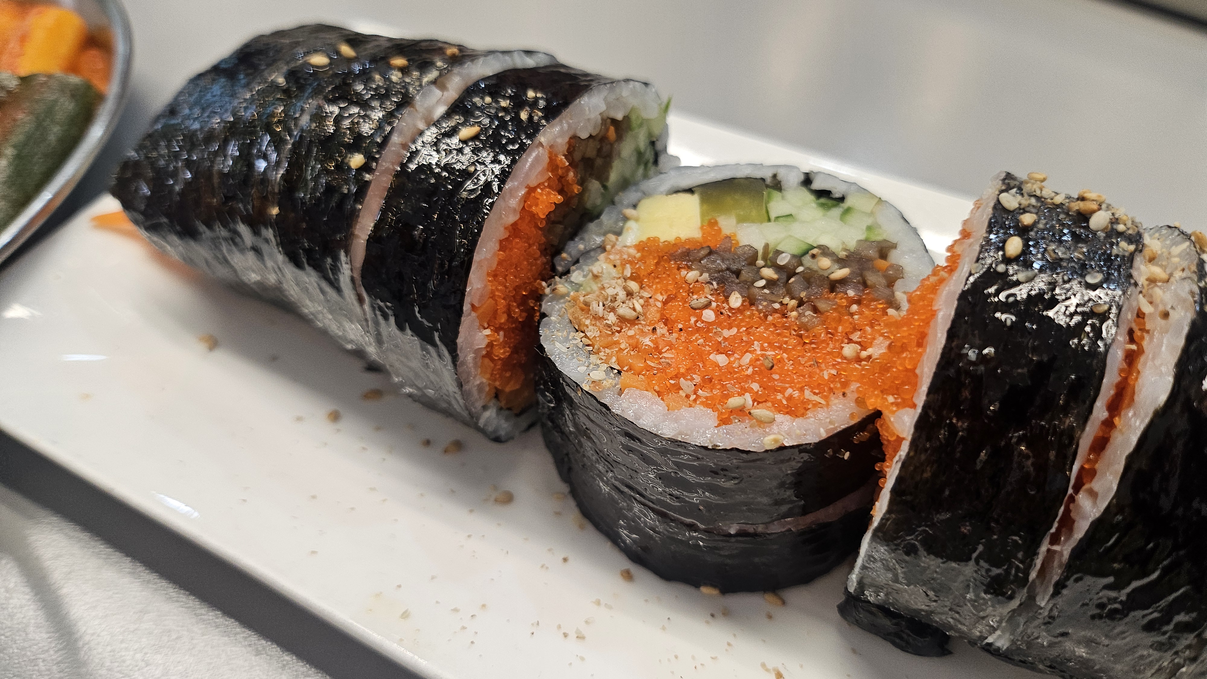 김밥부터가 좀 심상치 않다. 새우튀김김밥이 눈에 들어왔었지만 돈까스를 먹을 거라 튀김이 들어간 김밥보다는 날치알와사비김밥으로 선택했다.