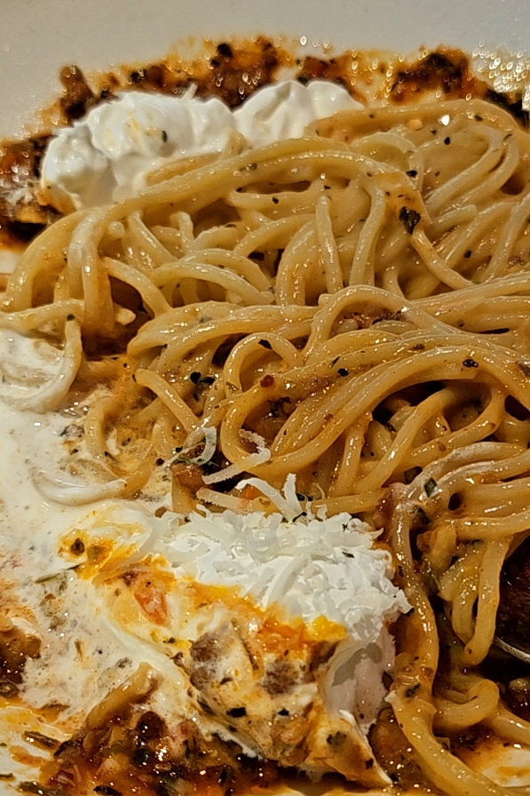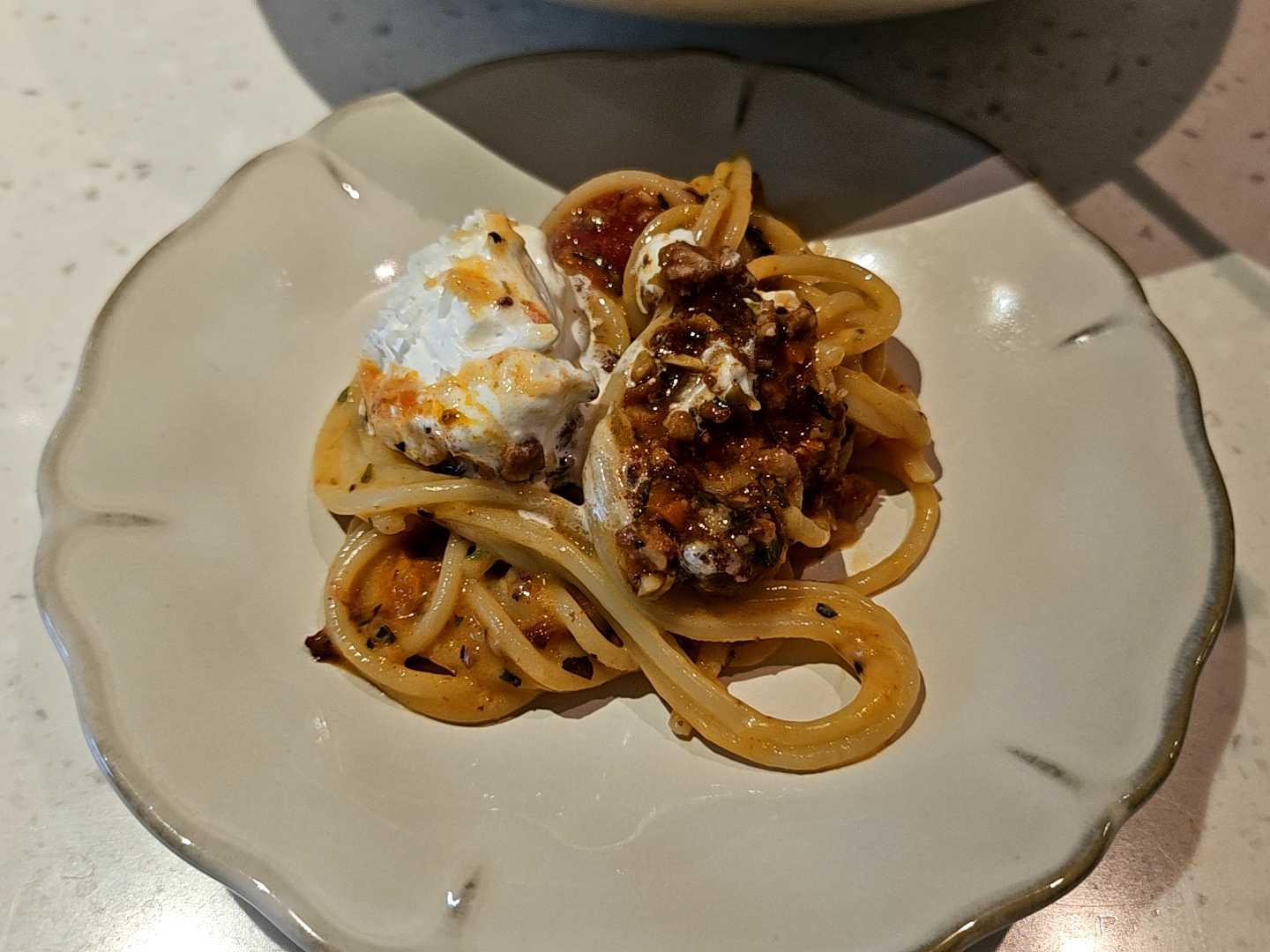 다 비비진 않고 라구 소스와 생크림 덩어리를 접시에 덜어낸 다음 맛을 봤다.