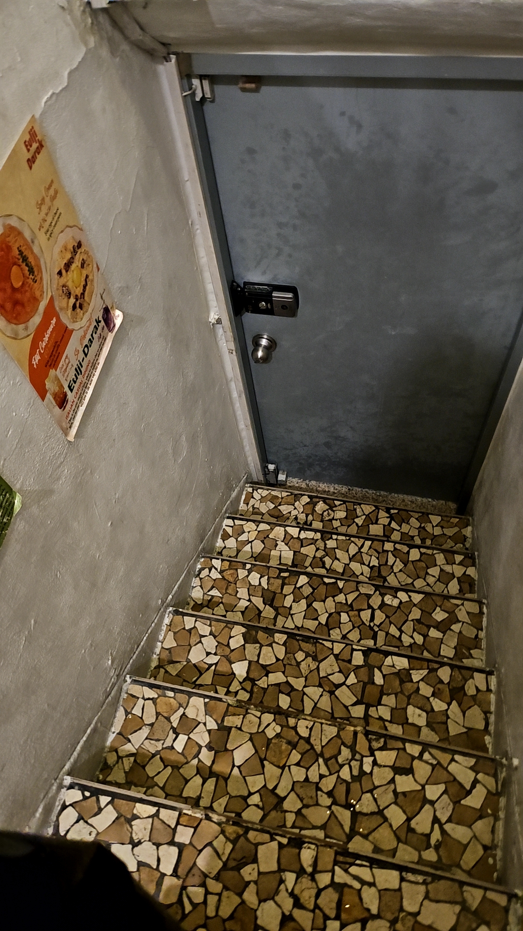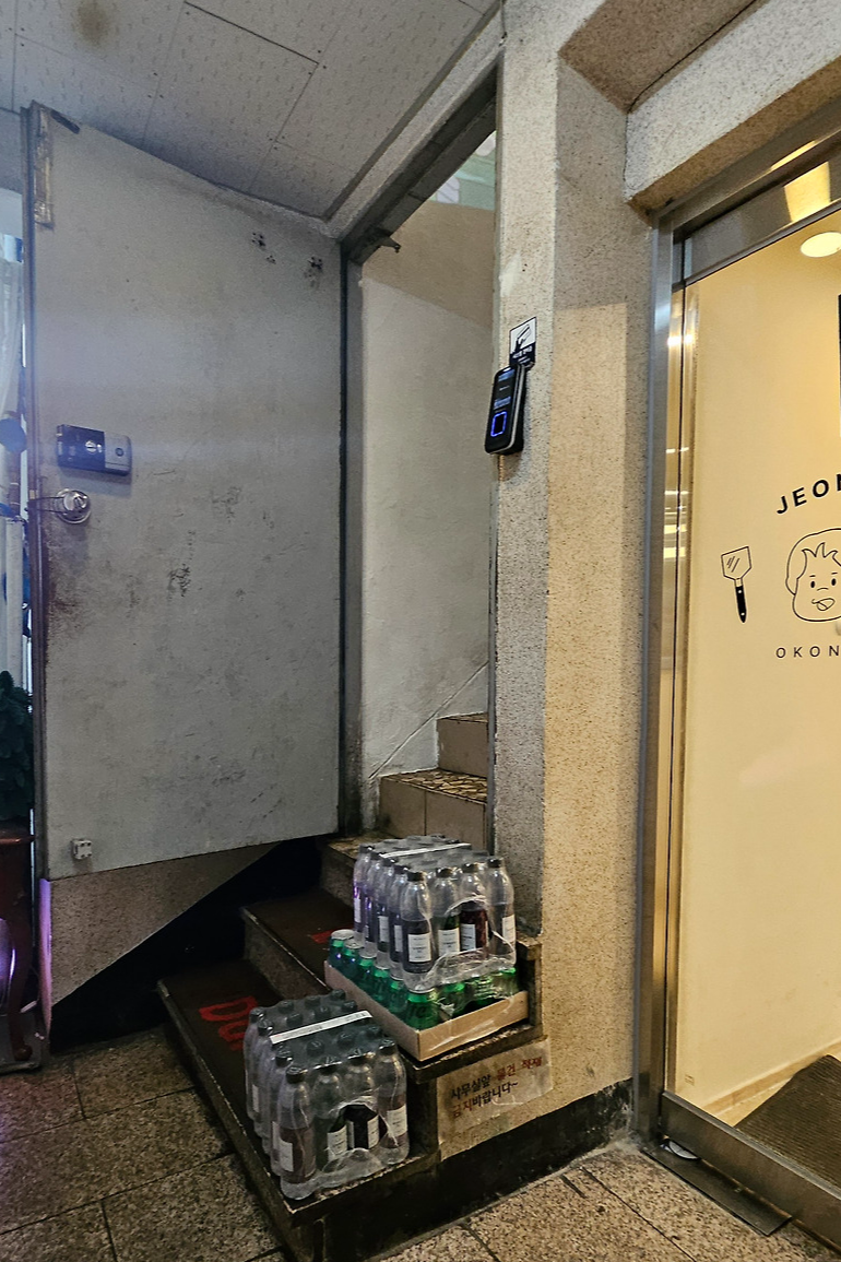 을지다락 위치는 지도를 보고 오더라도 헷갈릴 수도 있겠다는 생각이 들었다. 건물 제일 위로 올라가면 보이는 철문인데 철문이 열려있으면... 식당 문처럼 안 보여서 헷갈릴 수도 있다. 을지다락 나무 팻말도 옆에 세워져 있고 오코노미야끼 종화 문이랑 수상한 철문밖에 없으니 그냥 그 수상한 철문 쪽으로 입장하면 된다.