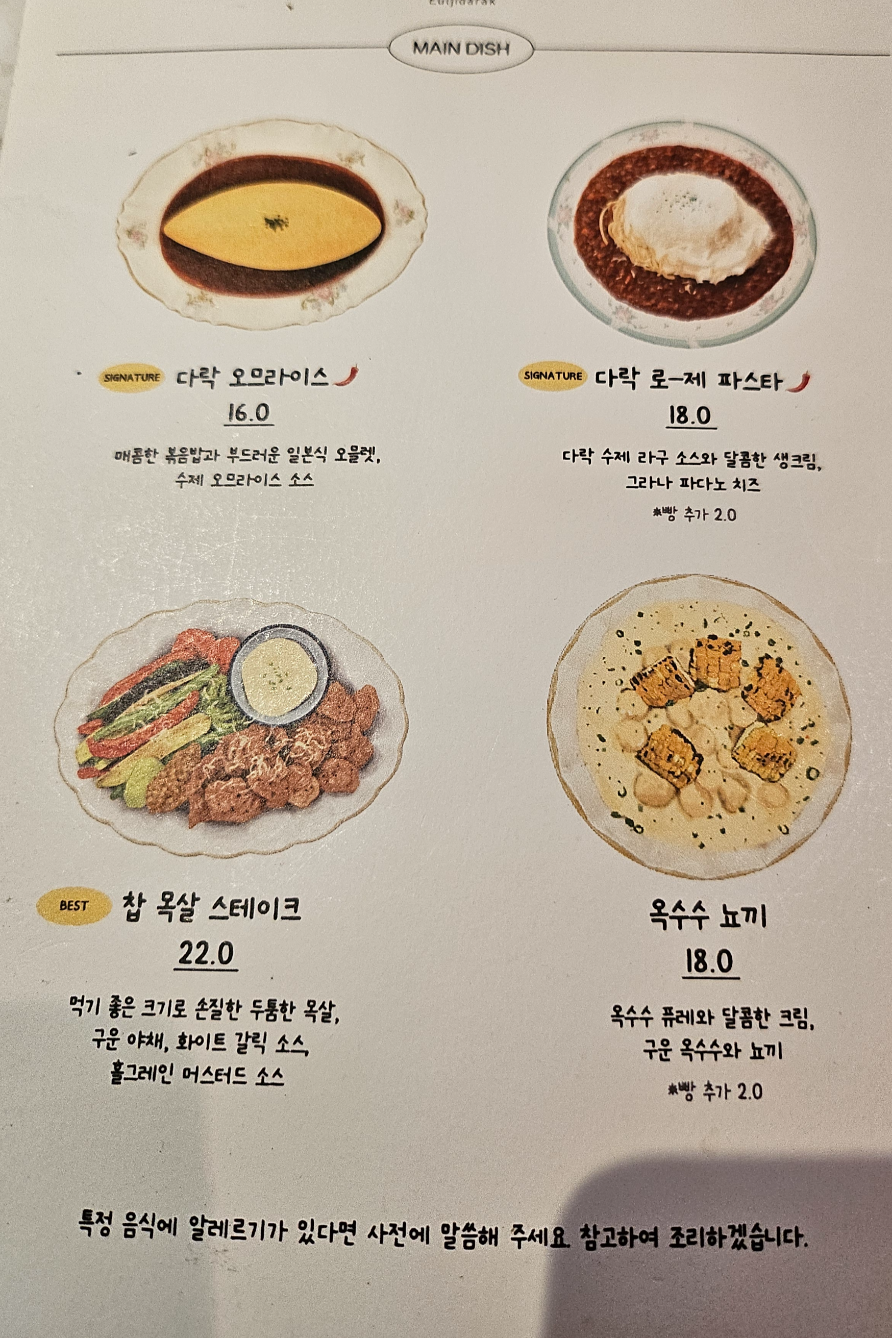 오므라이스, 파스타, 스테이크, 뇨끼, 리조또, 필라프 다양하게 있다. 매콤크림파스타는 쿠X에서 밀키트로 파는 걸 봐왔었는데 그래서인지 당연하게 저거는 빼고 뭘 먹을지 고민하게 되었었다.