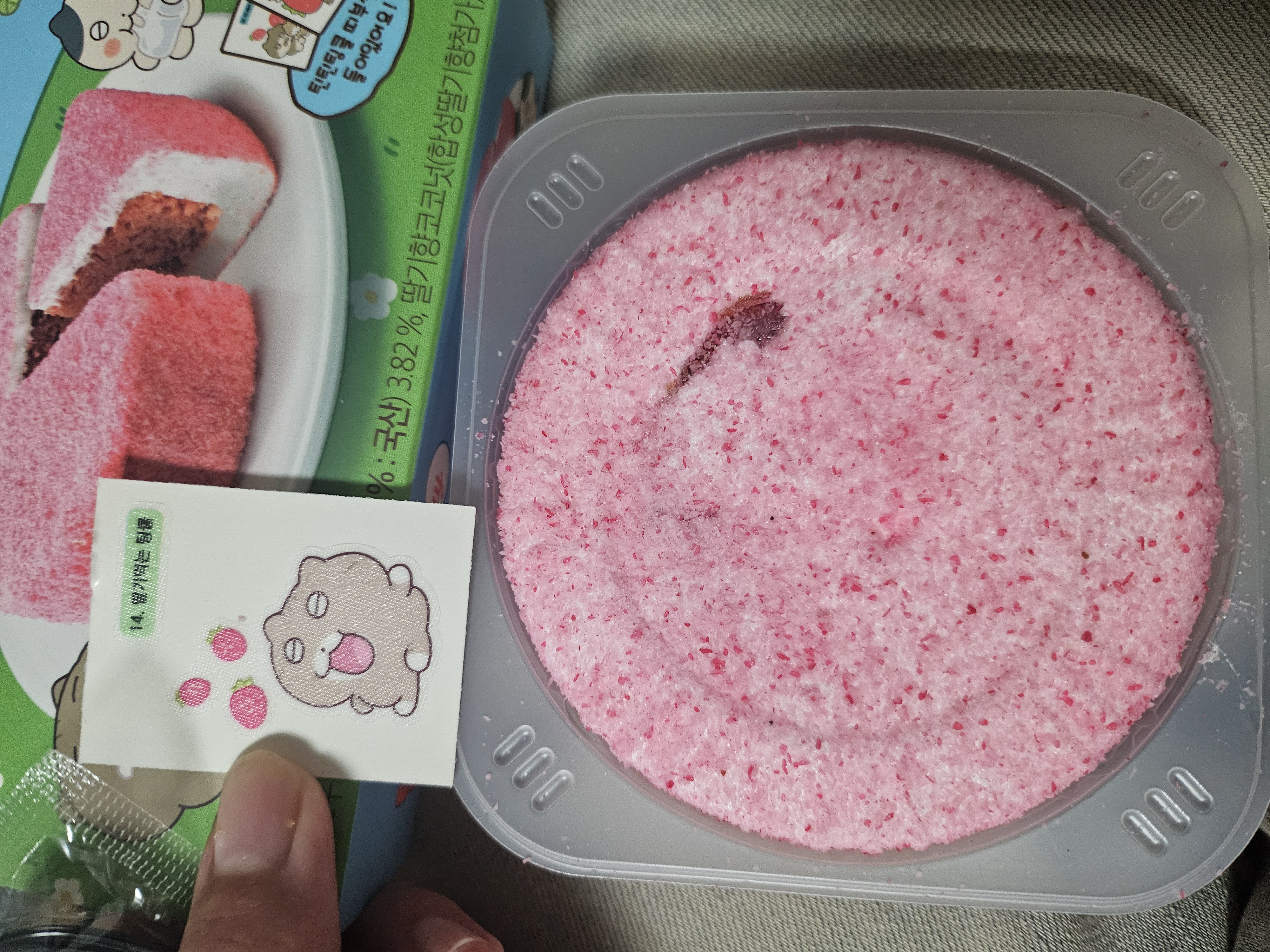 옆면을 이렇게 밀어서 꺼내면 케이크 아래쪽에 숨겨진 띠 씰 스티커가 보인다.
